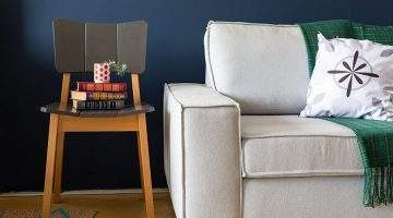 Ela é feita com a estrutura de madeira e espuma, revestida em tecido 100% algodão.